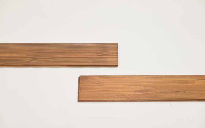 無垢床の王道、1.5cm厚の杉フローリングです。西粟倉森の学校で最も製造・販売する定番商品にアンバー、テラの2色をカラーバリエーションを追加いたしました
