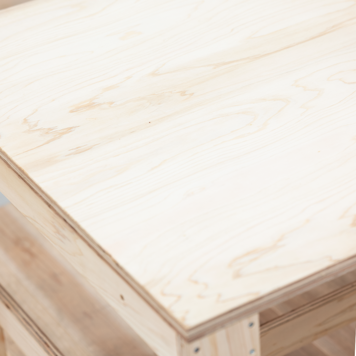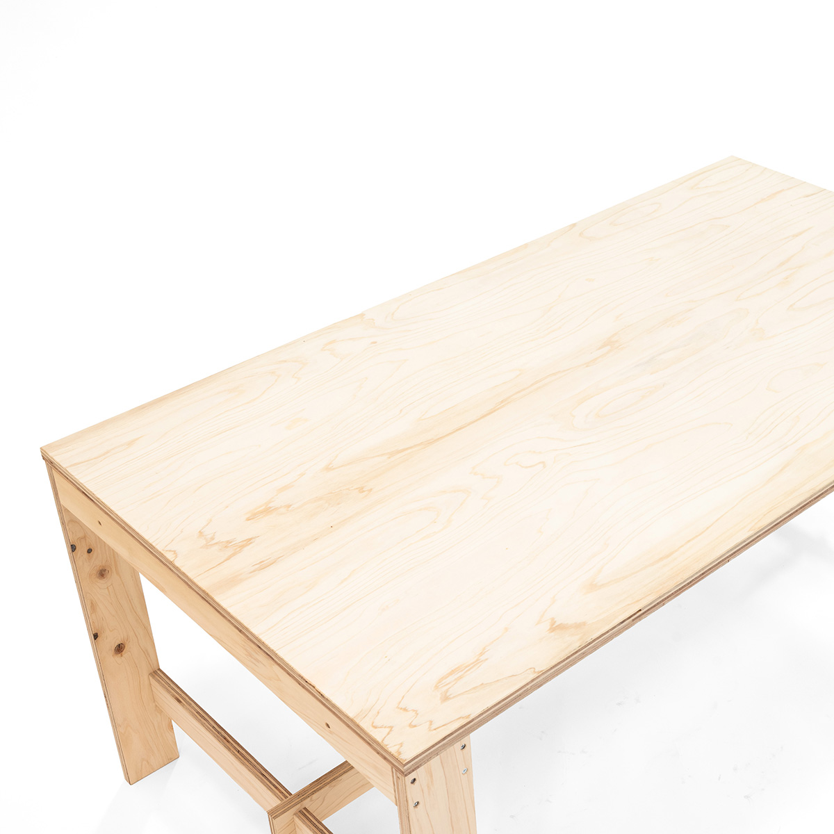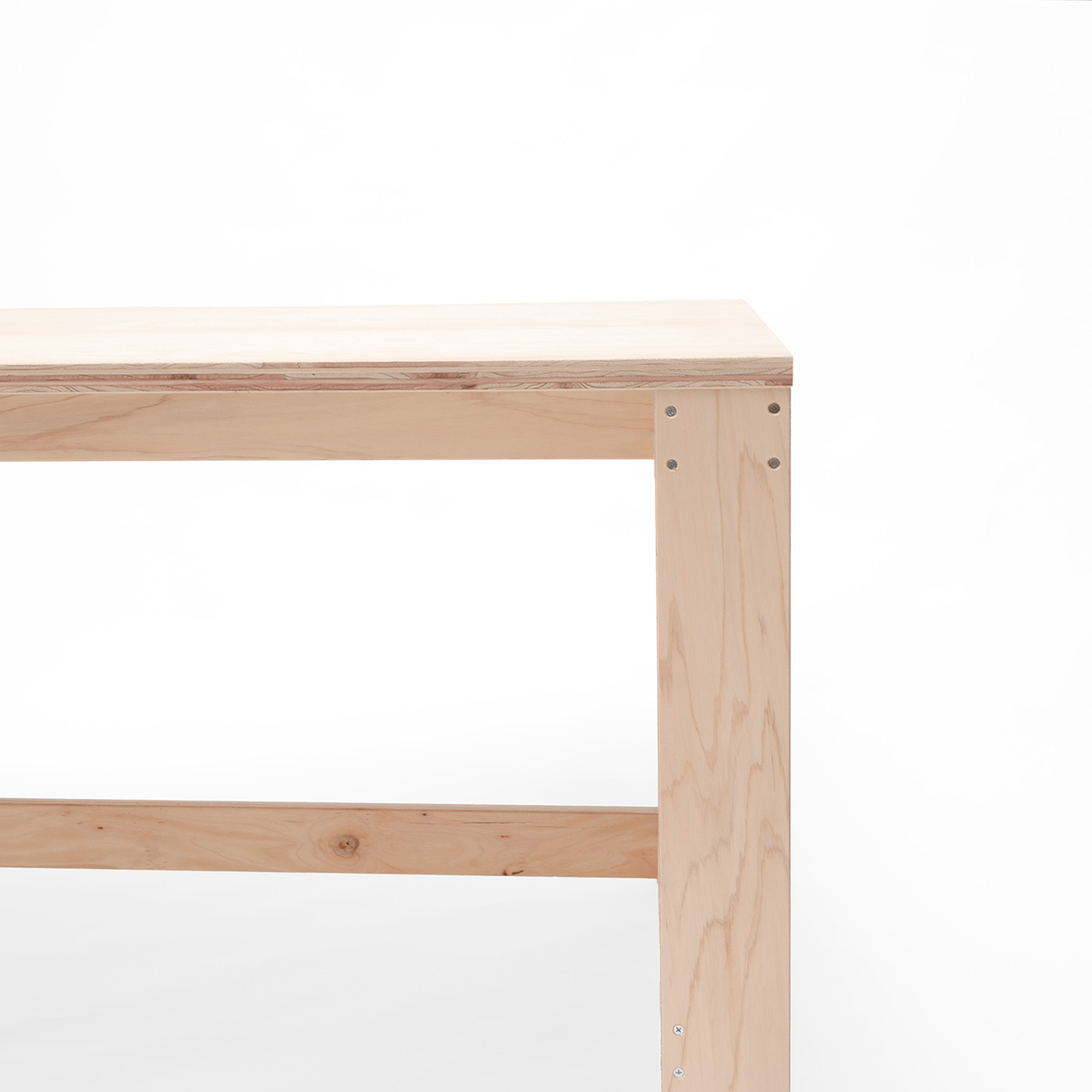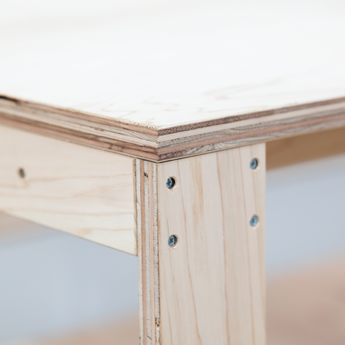 幅160cm×奥行90cmという、PCを置いても資料を広げ放題な「広さ」を確保しました。 素材にはFSC®認証合板を使用。その中でも特に「節(ふし)」のない綺麗な面を厳選しているため、ラフな合板家具でありながら、非常に清潔感のある上品な佇まいです。